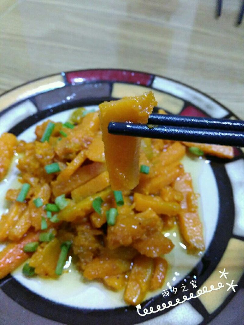 5:调入盐,翻炒下,这时候翻炒一定要轻,否则南瓜都会碎,变泥了