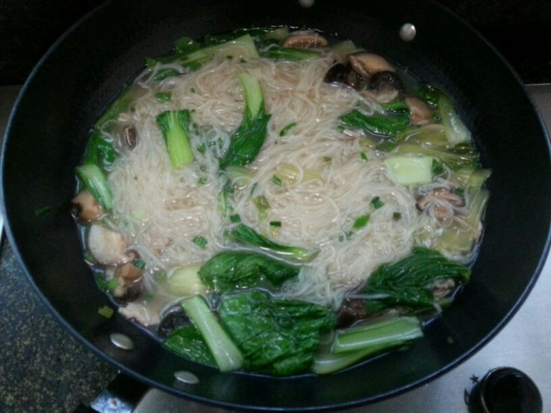 1:材料:咸线面若干,青菜3棵洗干净,海蛏干香菇干洗净用水泡开,肉片适量,小葱2棵