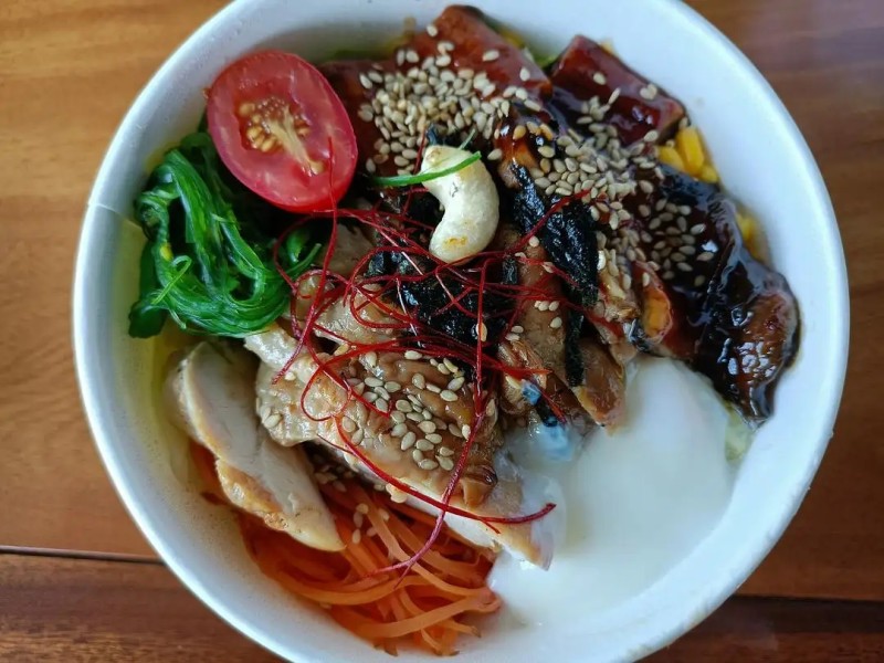 7:开始装盘!碗底先铺好米饭,依次放上鸡腿肉、鳗鱼、玉米粒、中华海草、胡萝卜丝、对半切的小番茄、半熟鸡蛋,最后撒上白芝麻,放腰果点缀。