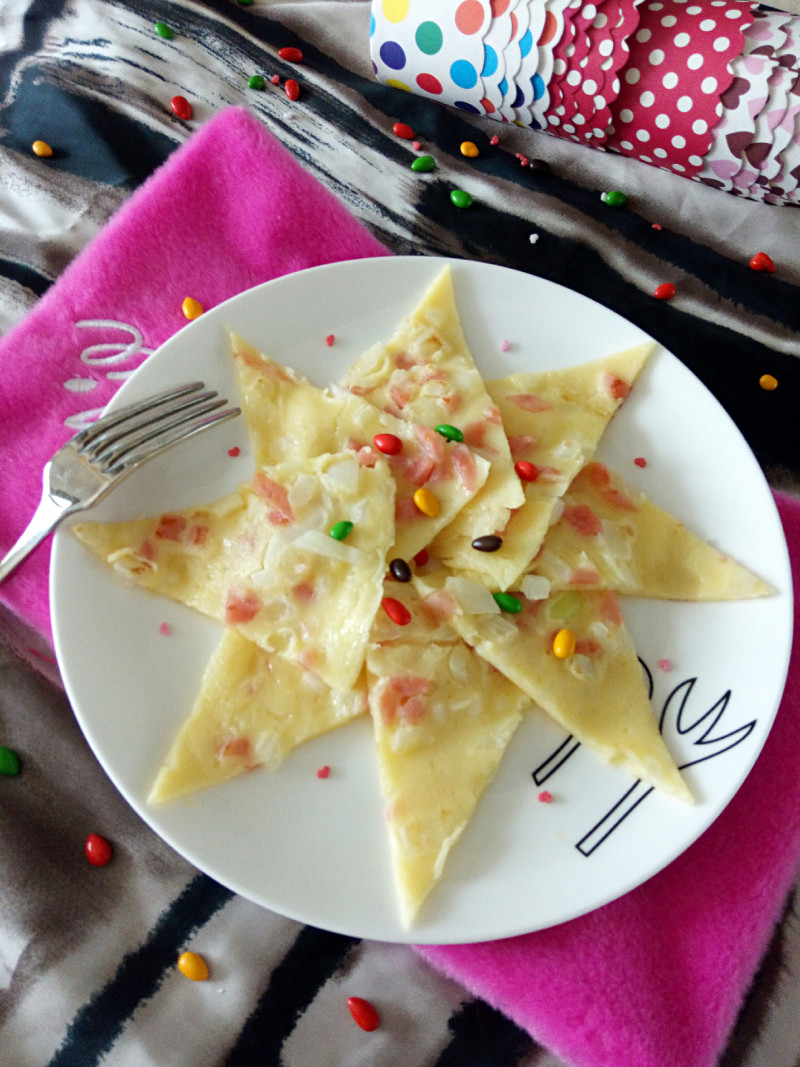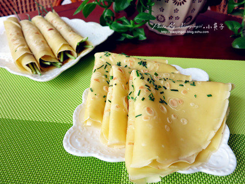 7:鸡蛋饼摆盘,撒点糖珠做装饰,香香的,美美的,太诱人了!