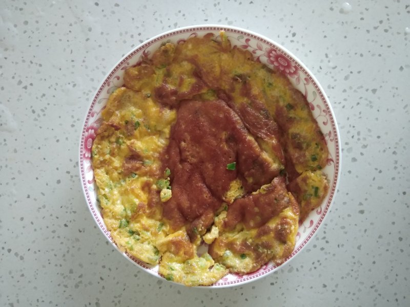 9:将切好的小葱洒在还没凝固的蛋饼上面煎