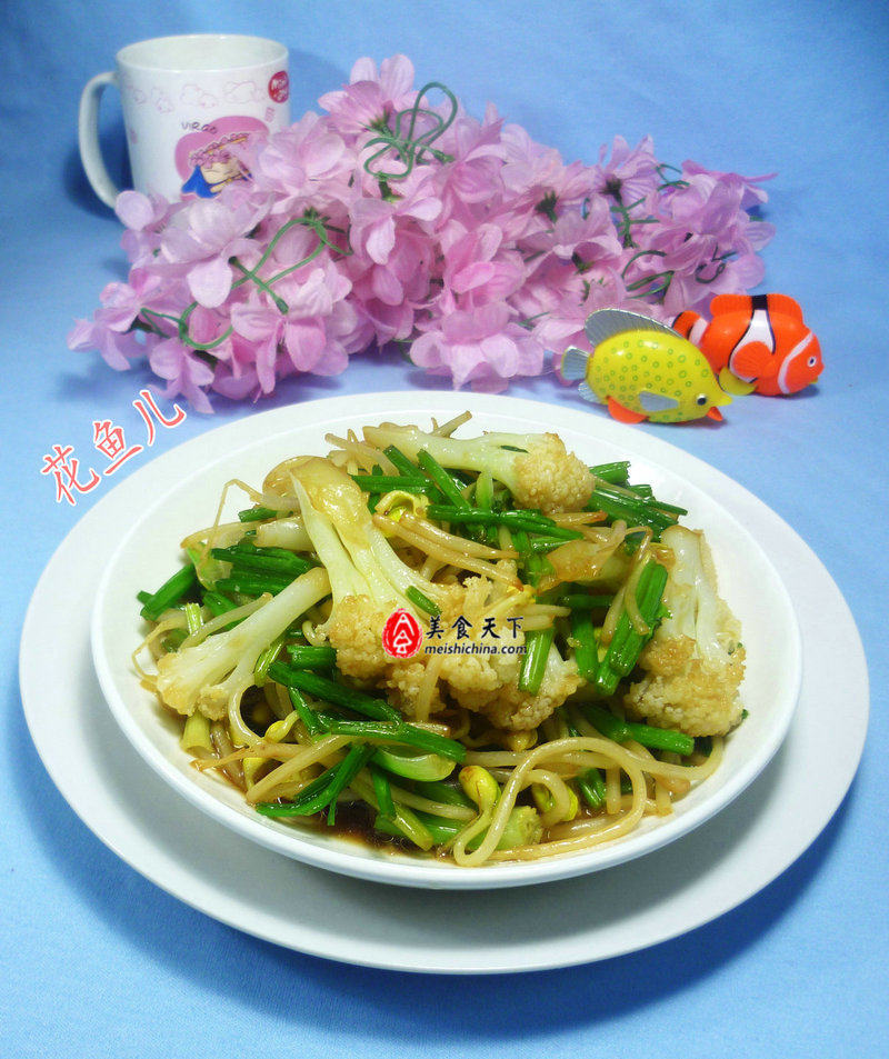 2:烧锅倒油烧热,下入已清洗好的花菜翻炒翻炒。