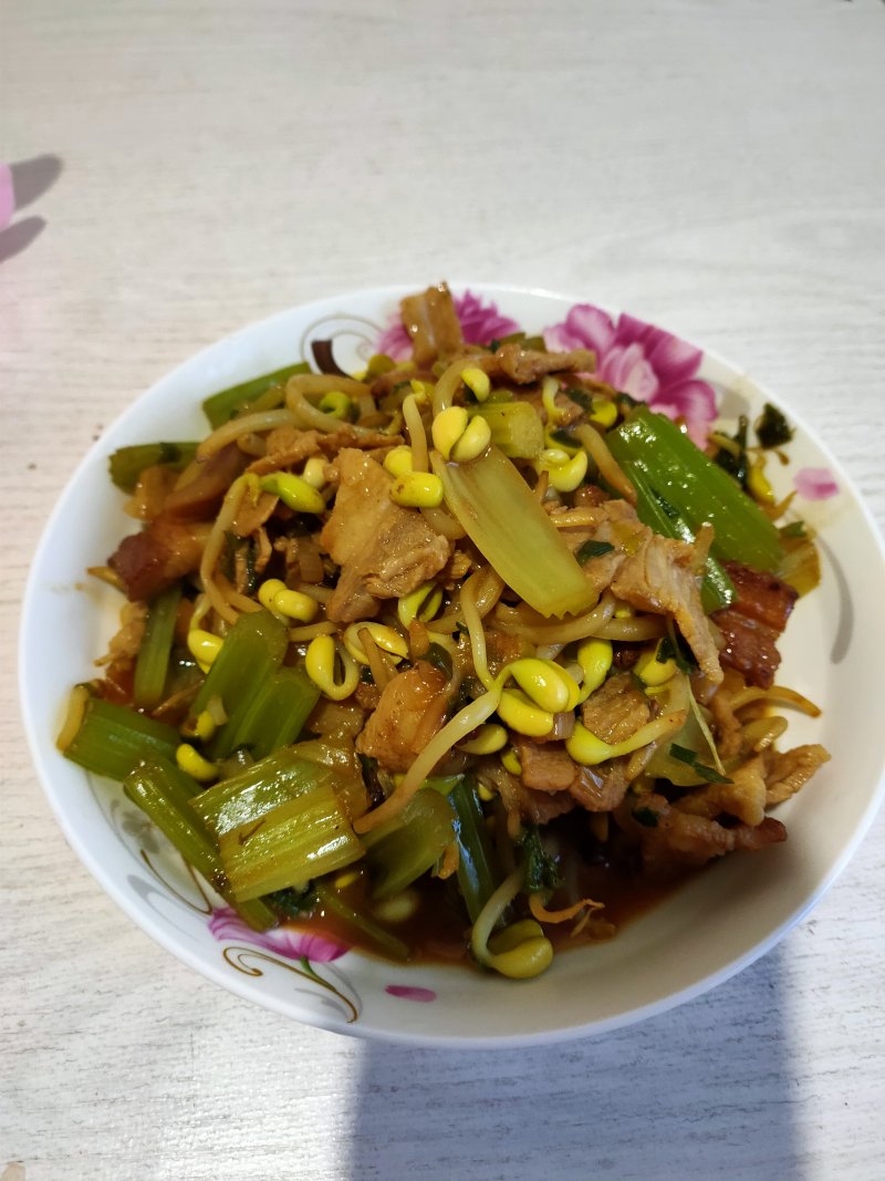 五花肉适量;豆芽适量;芹菜适量;小葱适量;