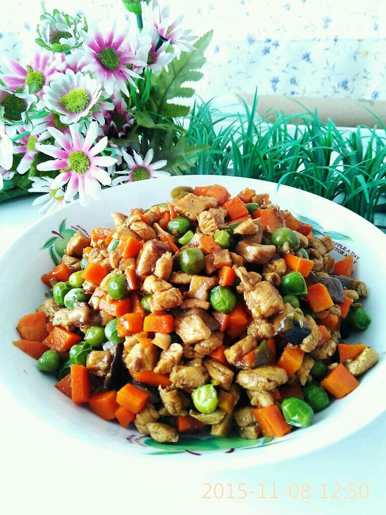 鸡脯肉250克;胡萝卜适量;青豆适量;香菇适量;