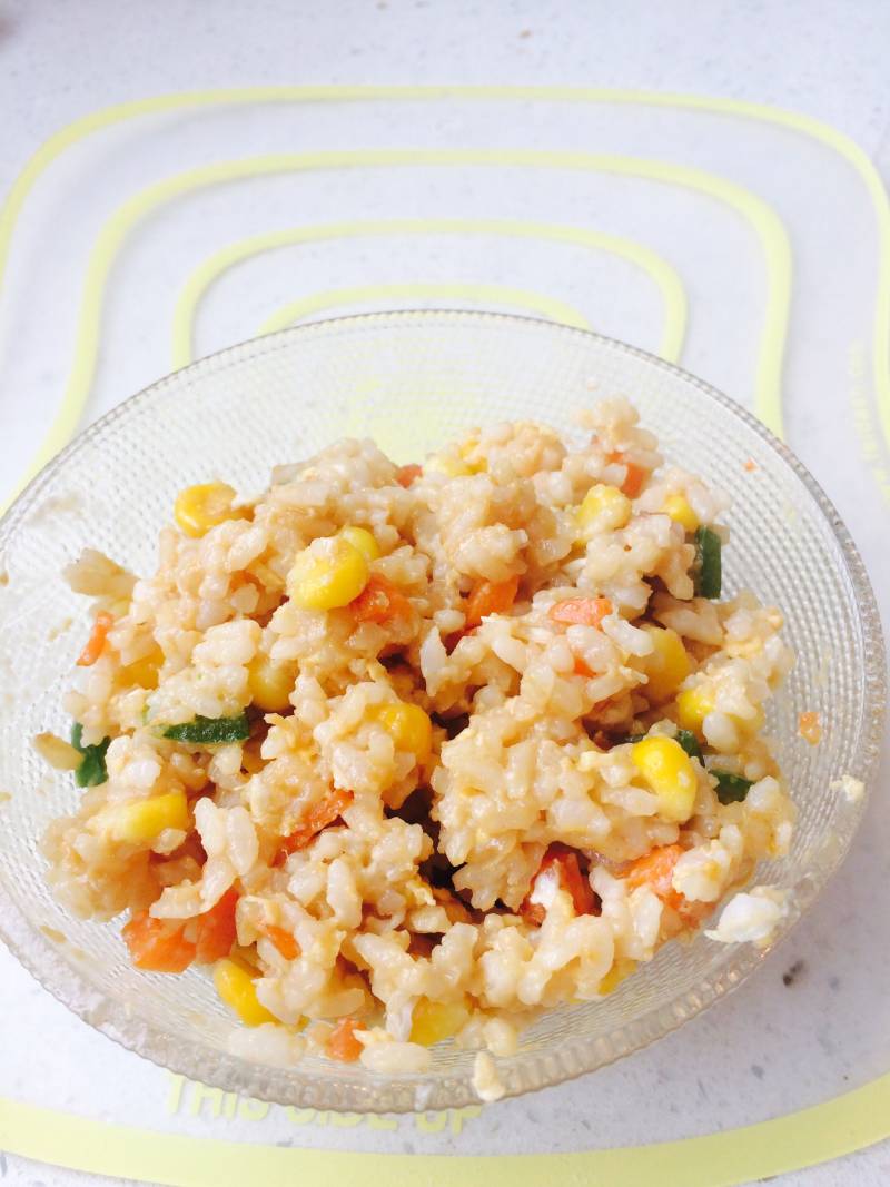 5:加入少量生抽和食盐调味,继续翻炒至饭与蛋颗颗分明。美味又营养的缤纷炒饭即可上桌。治愈了不吃胡萝不,不吃蔬菜的小朋友