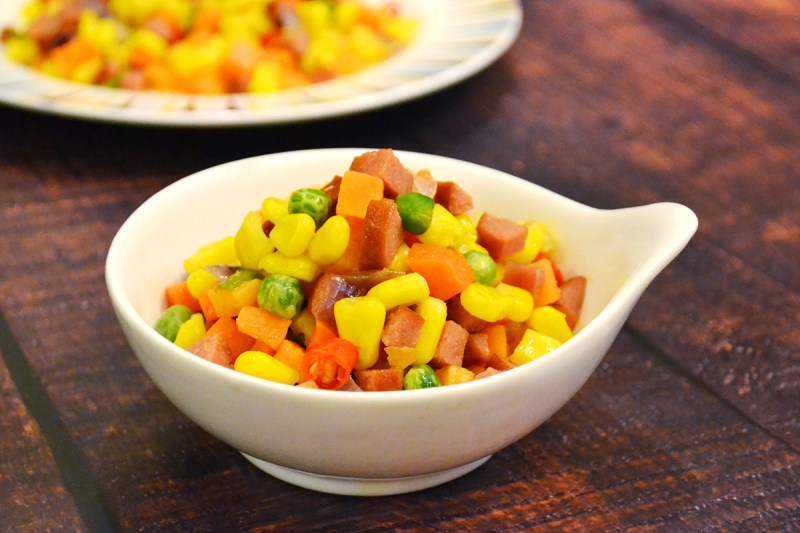 甜玉米1个;豌豆粒1小把;胡萝卜半个;牛肉肠1根;洋葱1/4个;