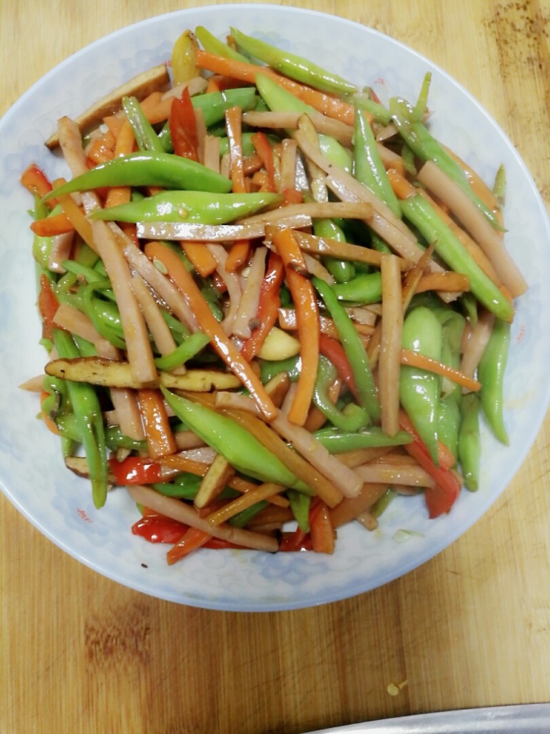 12:将之前准备好的豆角,青红椒丝,胡萝卜丝一起倒入锅中翻炒,加入少许盐继续翻炒