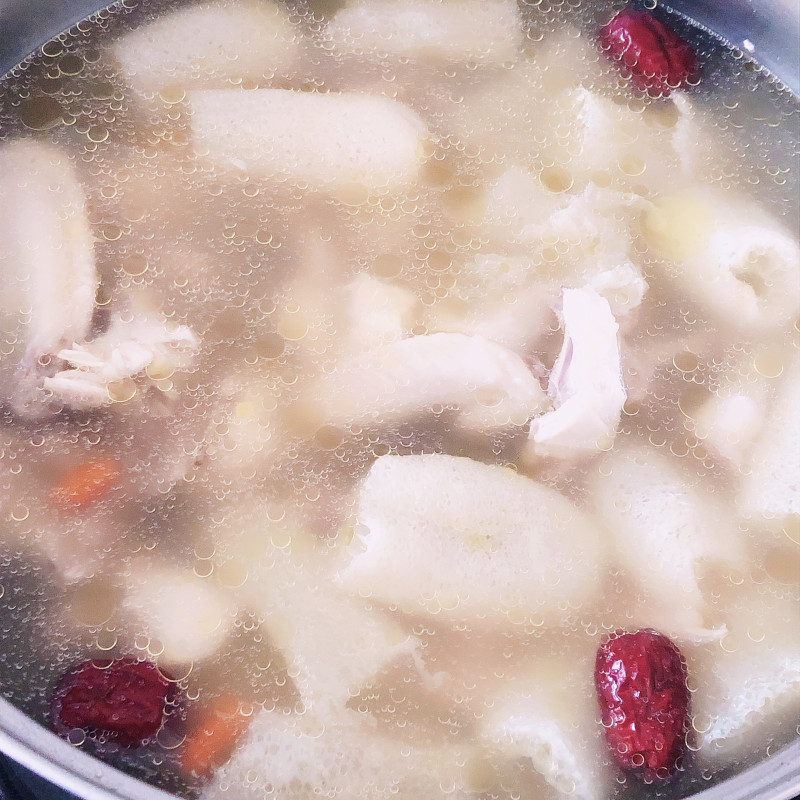 6:将山药,猪骨和生姜加入煲中,加适量清水,用大火把汤烧开,转小火慢炖1小时左右.