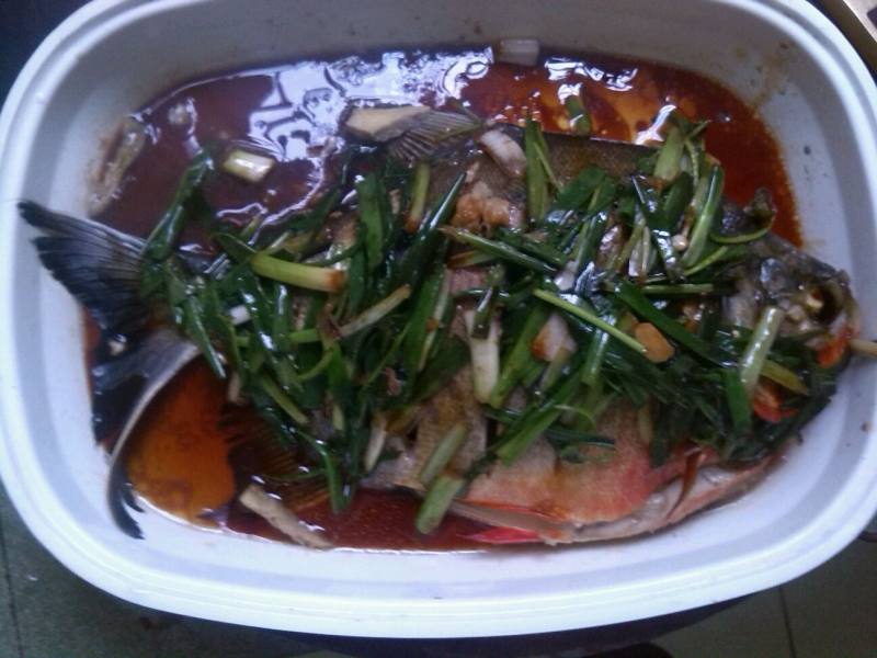 4:蒸好后倒掉汁,淋上蒸鱼酱油,泼些热油即可。
