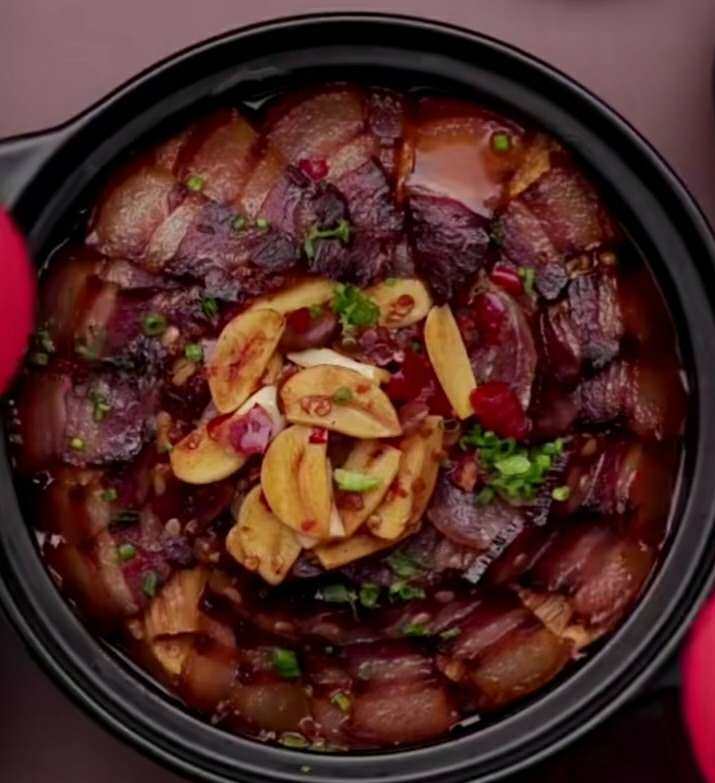 腊味焖豆皮是一道充满家常烟火气的传统菜肴,以豆皮为主料,搭配腊肉、香菇等近十种配料精心焖制而成。其做法讲究火候与融合:先将腊味煸炒出油香,再依次加入配料与豆皮慢火焖煮,直至汤汁浓郁、豆皮吸饱滋味。成菜咸香软糯,腊味与豆皮的结合恰到好处,既是冬日暖身的家常美味,也承载着朴素而温暖的饮食记忆。
