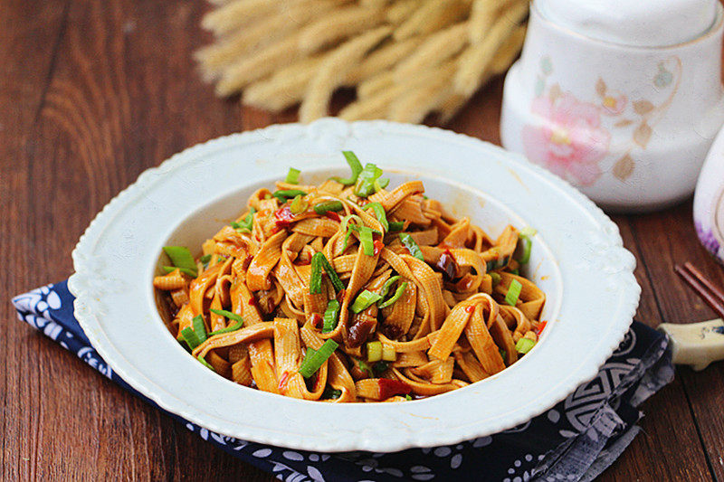 6:炒出调料香味后,放入焯过水的豆皮稍稍翻炒