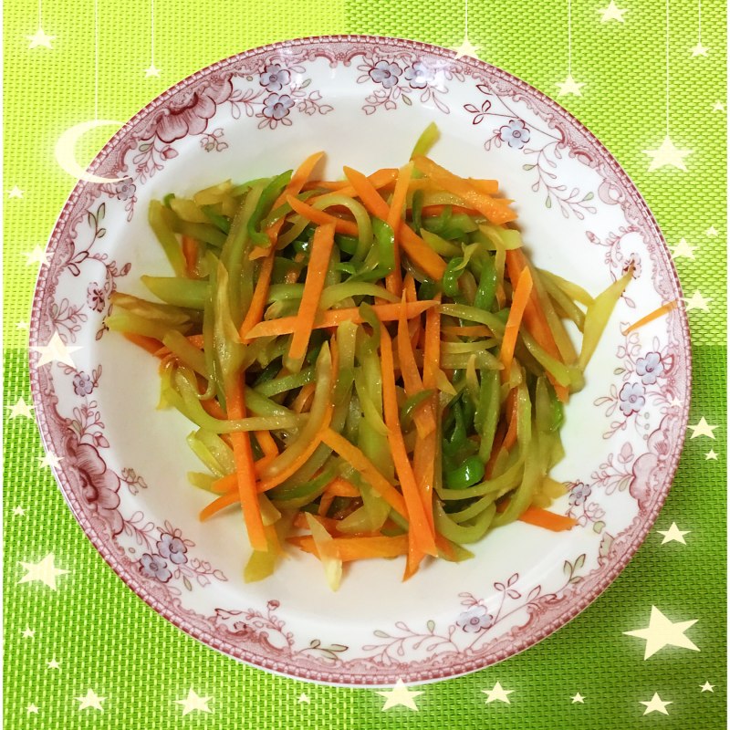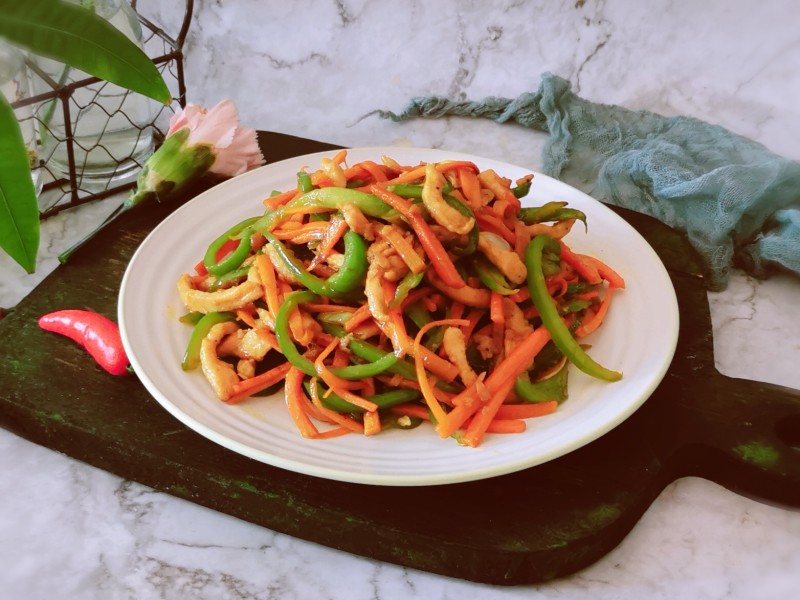 11:放入之前炒好的胡萝卜丝和青椒丝。