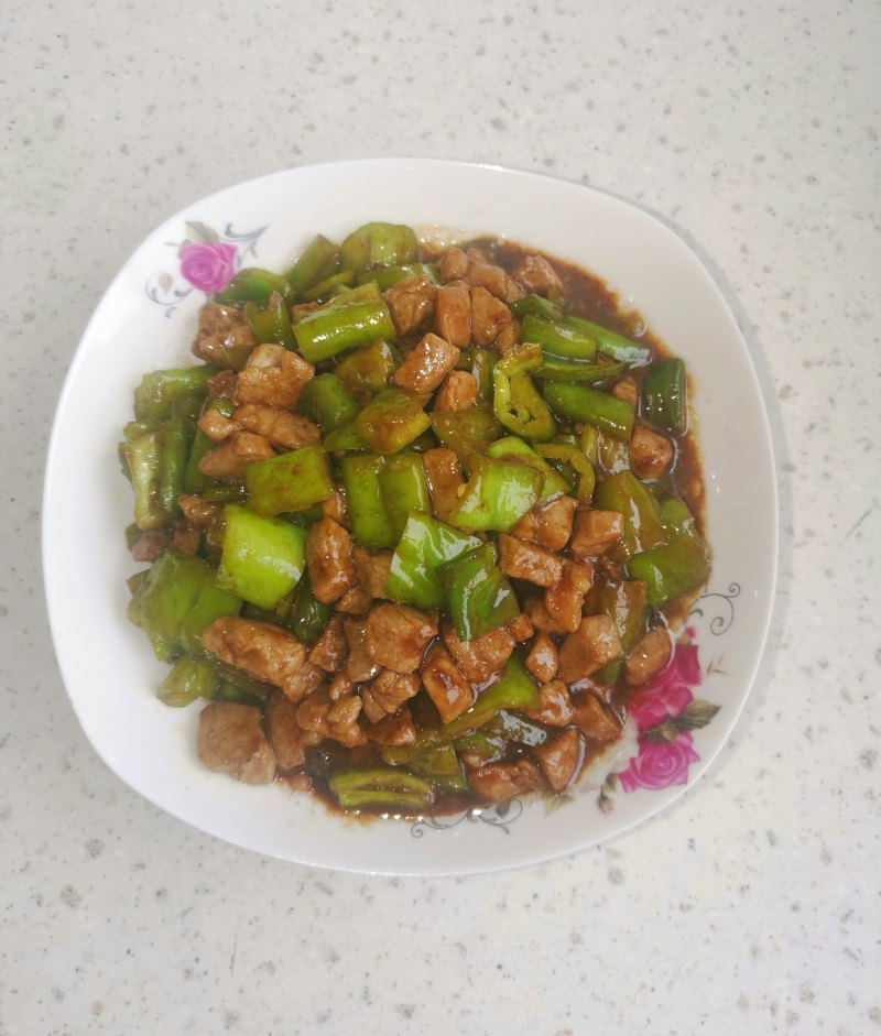 3:烧热锅放宽油,油热之后放入腌制好的肉丝,快炒以后乘起放入盘子。接着炒青椒放盐,因为肉腌制过程中放了盐和酱油所以后面就不用另外加盐了,按照个人喜好掌握青椒熟的程度放入肉丝,翻炒均匀之后用刚才腌肉的有红薯粉的汁兑一勺水勾芡,放入蒜末起锅。