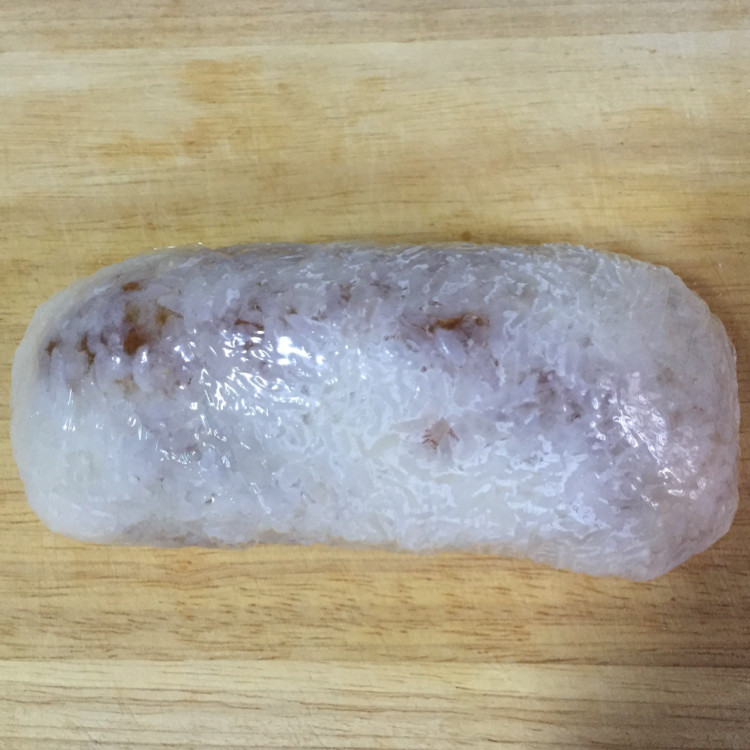 3:用海苔将米饭肉丁卷出寿司。再用保鲜膜将寿司做芯再包裹一层。寿司芯还做土豆丁馅料的。也算荤素搭配。