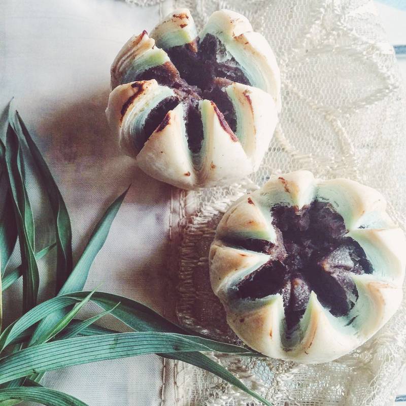 2:水油皮用料:1、面粉100克、开水50克、糖5克、猪油15克混合后揉成光滑扩展面团。2、面粉100克、开水50克、糖5克、猪油15克、果味蓝莓粉4克混合后揉成光滑扩展面团。用保鲜膜盖上静置。