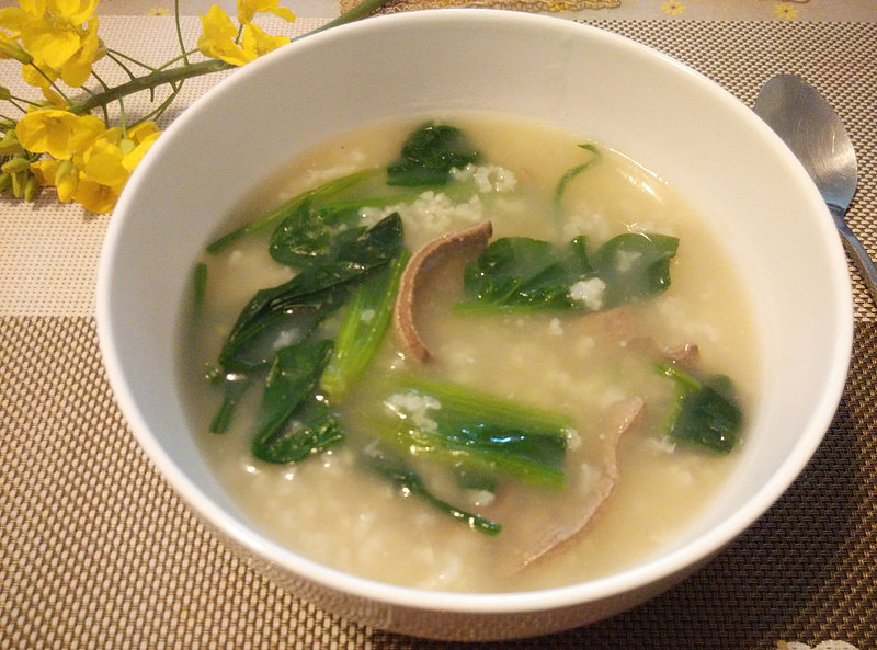 5:白粥煮好,放入姜丝,猪肝片,白胡椒再煮10分钟左右,放入菠菜段,香油即可