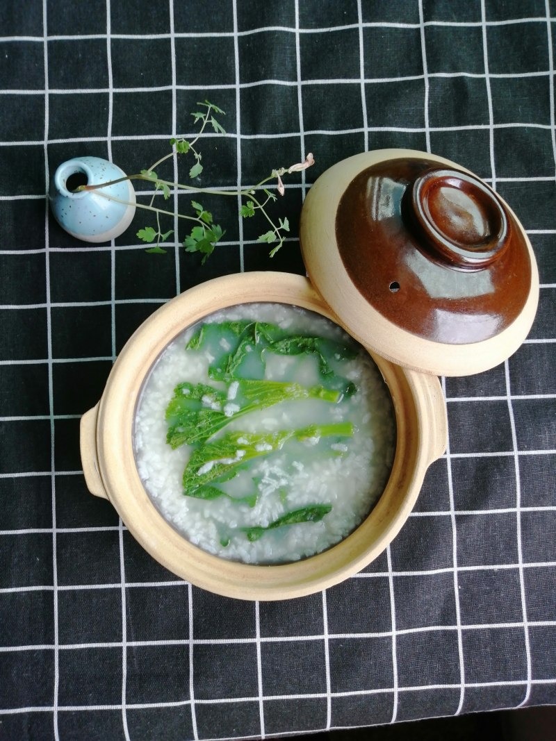 3:粥快熟了的时候加白菜或者你喜欢的菜菜放进去搅拌两分钟后放鸡肉肠就可以出锅了很清淡的配上咸菜好好吃噢