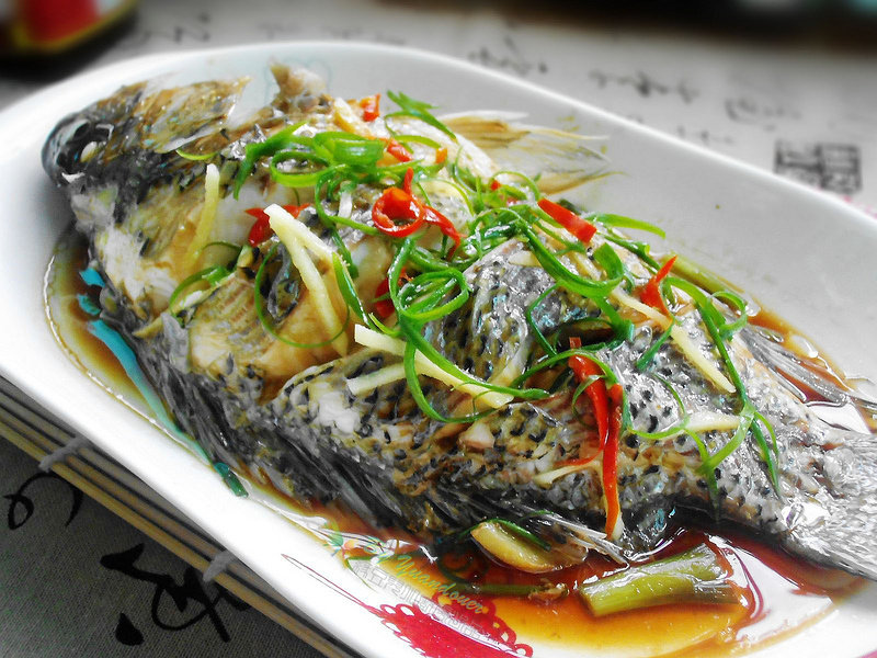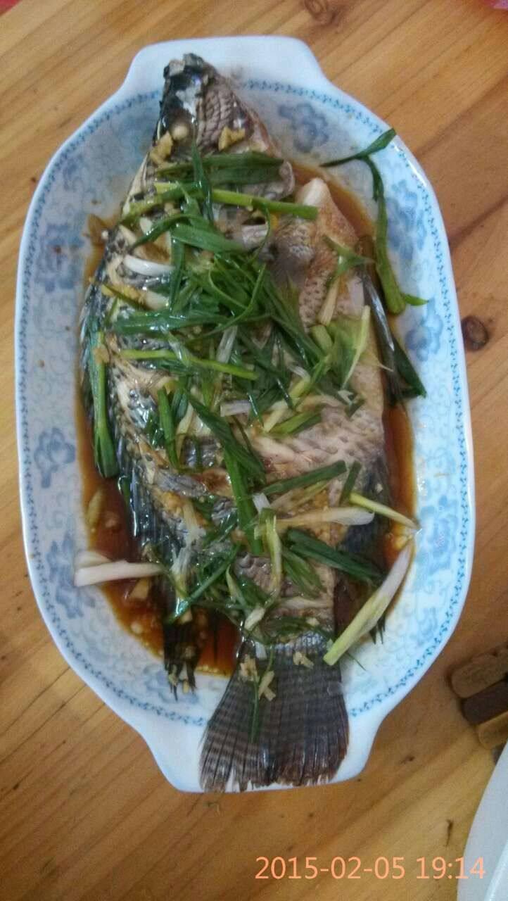 7:放上姜丝葱花和椒丝,另锅中加油烧至冒烟,淋在鱼身上就可以了。