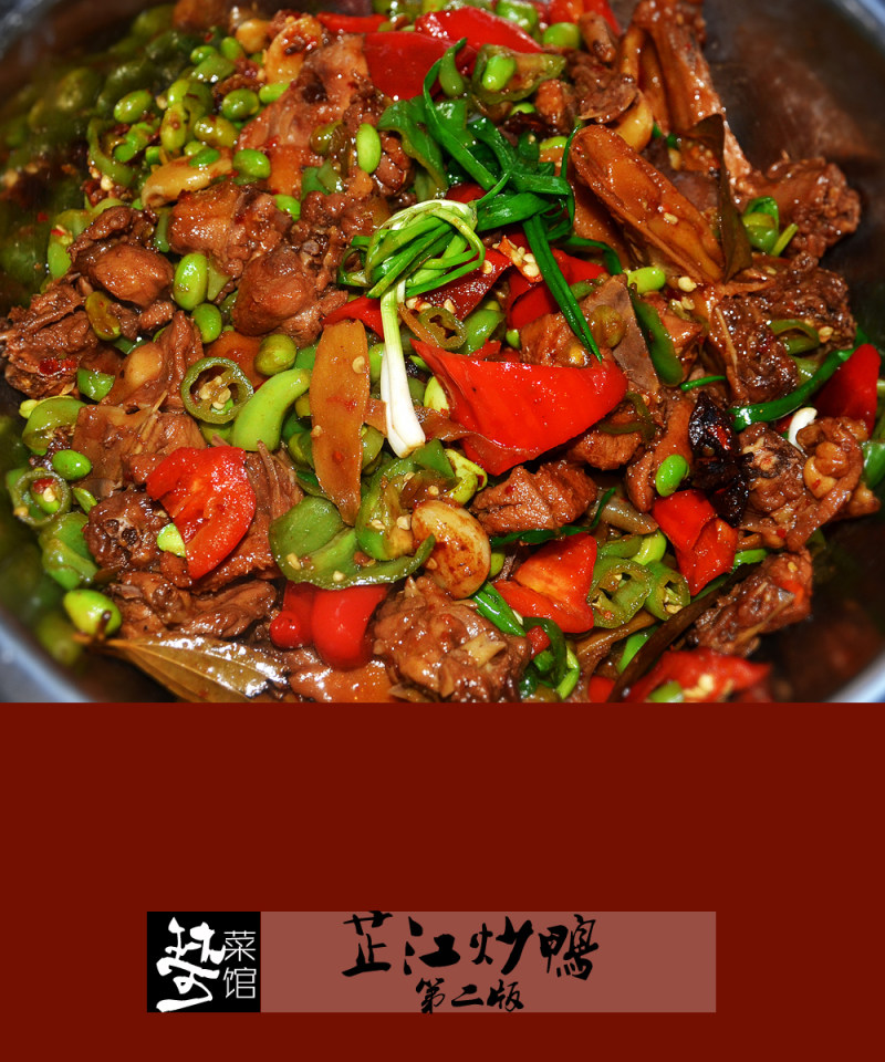 2:首先需要起锅烧油,油要多放点,将鸭掌,鸭头,鸭翅,鸭肠鸭内脏过油,炸制金黄,然后再放入剩余鸭肉,加入干红辣椒,八角、桂皮和香叶,翻炒金黄。再放入五花肉翻炒。炒制金黄后放入姜蒜,米酒,洪江甜酱,老抽,味精,盐,木姜油根据自己口味添加。再根据口味添加适量藤椒油。洪江甜酱是芷江当地专门炒鸭子用的。翻炒一会加水盖过鸭子,盖上盖子闷煮一会。