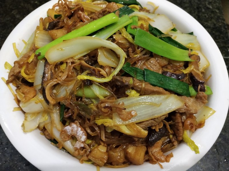 8:准备食材。把瘦肉切成丝,泡好的海鲜干货捞出来控干水分备用,香菇切丝,娃娃菜也切成丝。葱切碎,蒜苗切段。福寿全的配菜差不多就是这几种,也可以再加点胡萝卜丝和香菜,娃娃菜也可以用白菜。