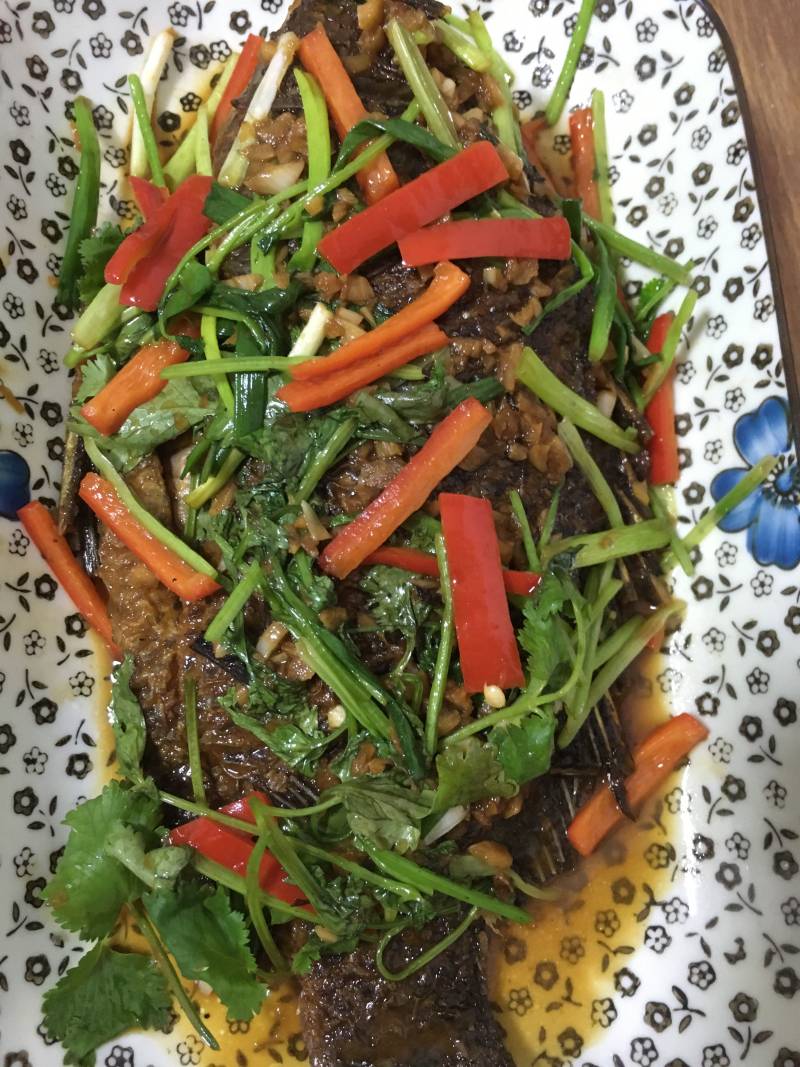 4:锅里留少许油,红椒和香菜梗迅速爆炒出香味,断生盛起备用,接着下少刚盛起的油下葱姜蒜末爆香后下备好的酱料加一碗水,待水开鱼下锅焖烧(火力中火),直至鱼软入味、汁浓稠盛起鱼留汁、备好的香菜梗红椒,葱叶段,香菜叶平铺鱼表面,最把热酱汁淋在香菜红椒葱段上,大功告成!