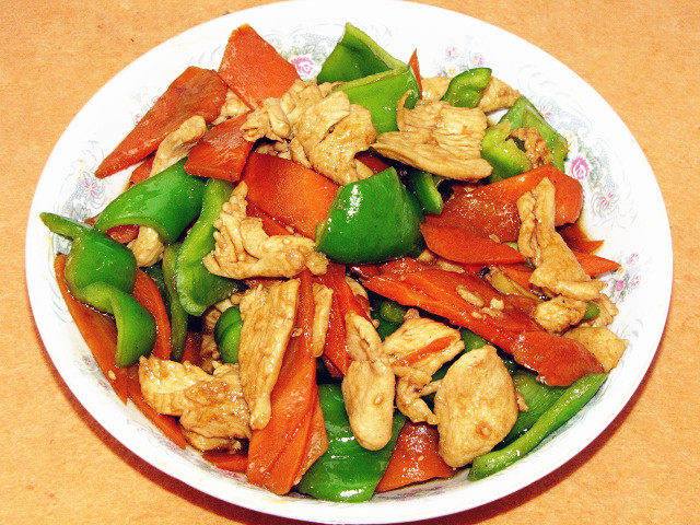 鸡胸肉250g;胡萝卜80g;青椒30g;