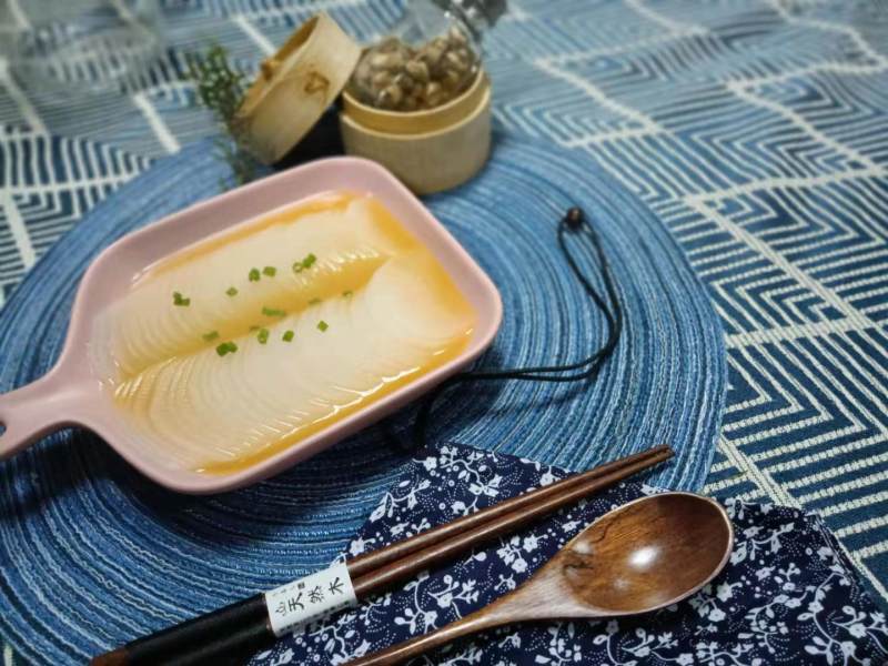 4:捞出后装盘,盘内倒入鸡汤,隔水蒸40-50分钟
