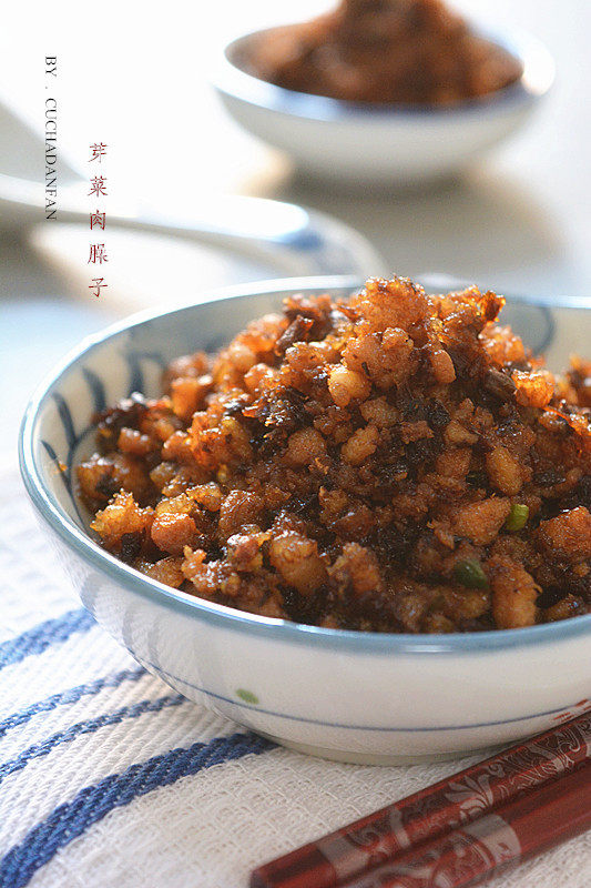 8:炒几分钟榨菜就放肉丁炒3分钟,不用放盐,因为耗油有盐,榨菜也有盐。