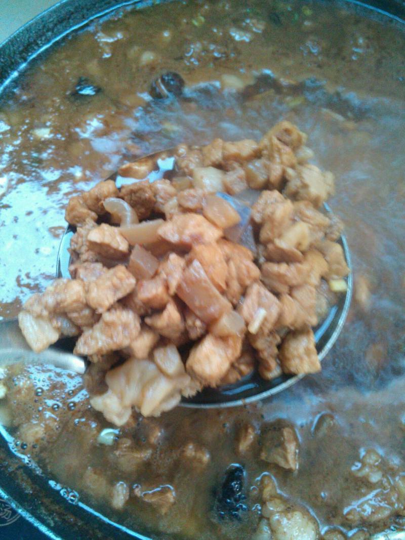 4:一忙给忘记拍照了,先在锅里放肥肉,再放入各种调料,肥肉刚入锅扁的油是白色的,待油清亮以后放入瘦肉至油清亮,这个时候要倒入醋,我是四斤肉,放了一斤半的醋,,再倒入老抽,一点就够,上个色,等烧开后,倒入一点水,这样不至于把油炼干,这时再放入葱和姜,汁收一会就可以放盐出锅啦,
