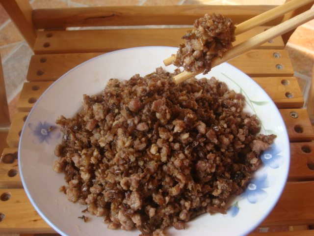 6:继续炒3分钟,要炒到肉末水分已经没有了,表面已经有点干了的时候