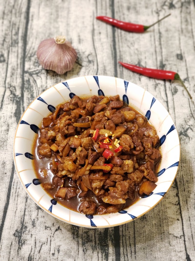 5:至锅内的油变清亮,肉缩水变干颜色红亮时关火。