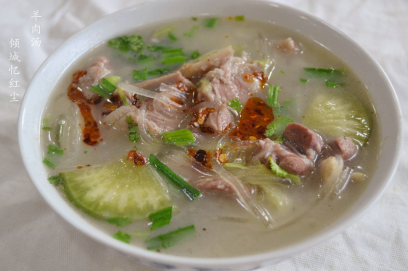 羊肉1000G;青萝卜1小块;白菜适量;红薯细粉适量;蒜苗适量;香菜适量;大料包适量;橙皮适量;姜片适量;花椒适量;