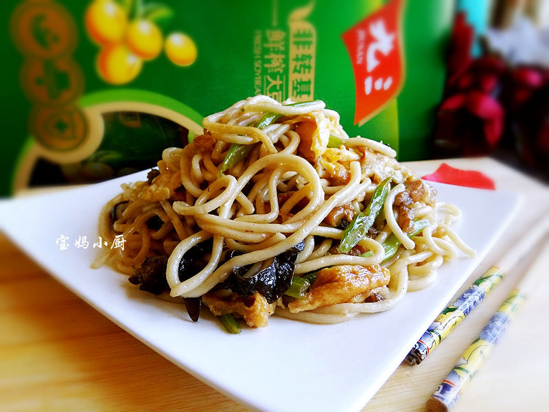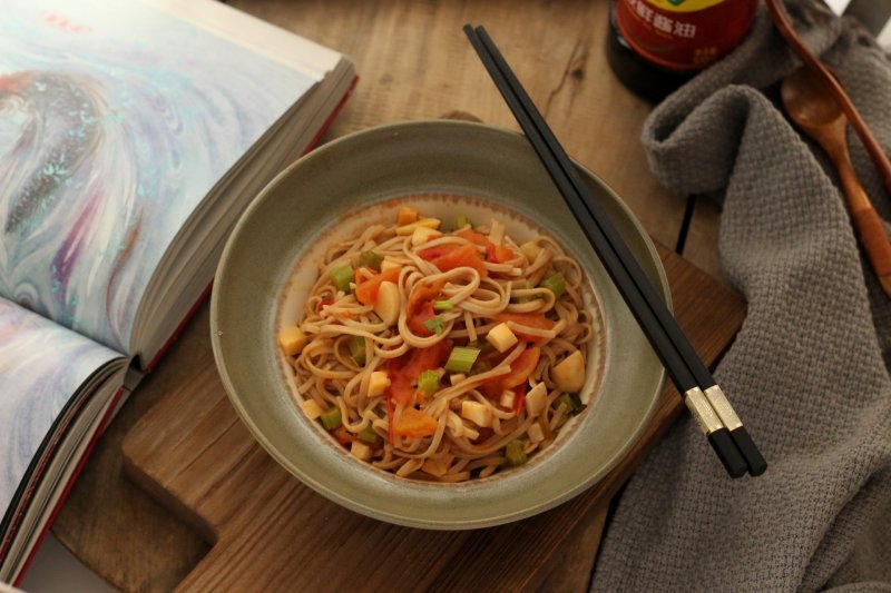 9:加入沥干的荞麦面翻炒,让面条均匀沾水汤汁。