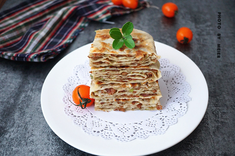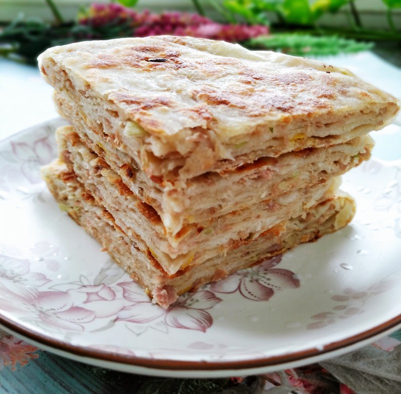 千层肉渣饼,一道承载着北方风味的传统面点。其精髓在于手工擀制的面皮薄如蝉翼,层层叠叠间均匀铺入精心煸炒的肉渣与秘制香料。入锅后,热油渗透每一寸缝隙,外皮逐渐烙出金黄焦脆的硬壳,内里却依然保持着柔韧的层次。咬下去的瞬间,咔嚓声清脆悦耳,酥皮应声碎裂,浓郁的肉香混合着麦香顷刻满溢口腔,酥脆与咸香在齿间交织,让人回味无穷。