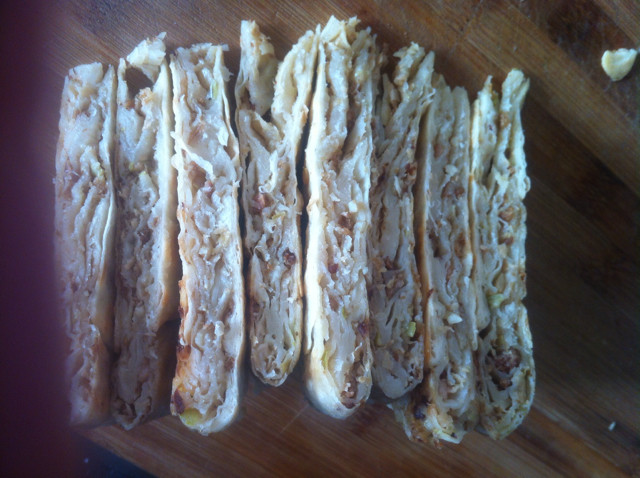 12:取出做好的肉渣饼,切成段装盘,那叫一个香啊