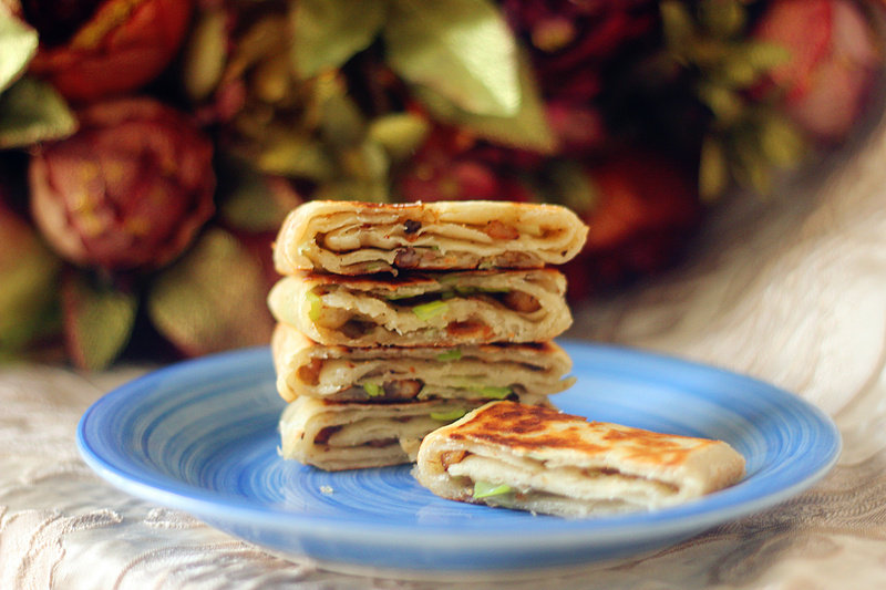 12:饼身厚度比生坯有很大程度的增涨,说明内部串气成功,馅料熟了,千层饼烙至两面金黄即可出锅,分四块可食用;烙这张饼时可以把第二个饼也擀好、折叠完成,时间不耽误。