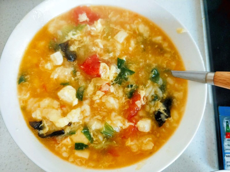 5:锅内倒油,油热把西红柿和小白菜放锅炒,然后放入豆腐,锅内加水烧开,放木耳和剩下的鸡蛋液,倒入疙瘩搅拌