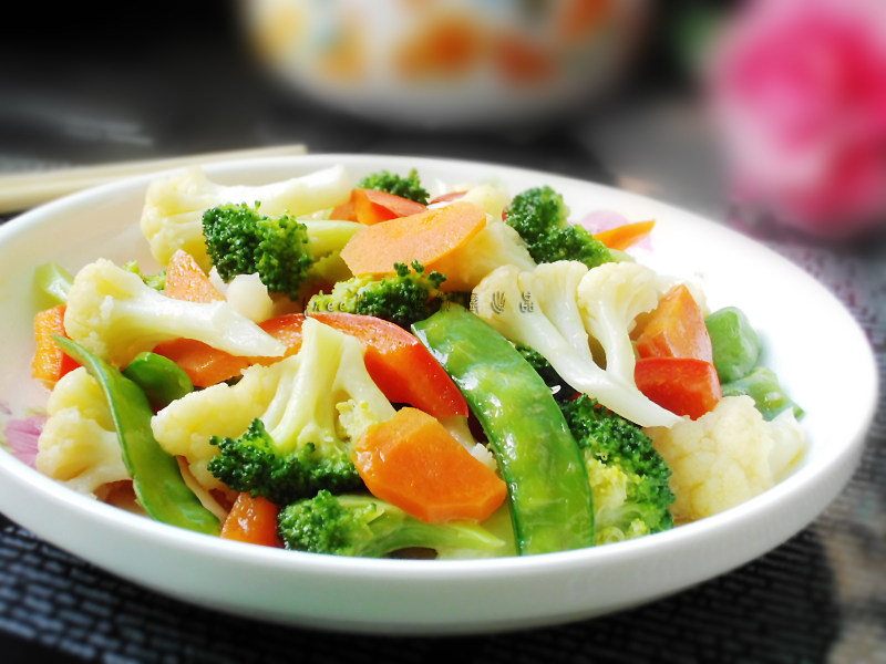 西兰花适量;菜花适量;胡萝卜适量;红椒适量;荷兰豆适量;