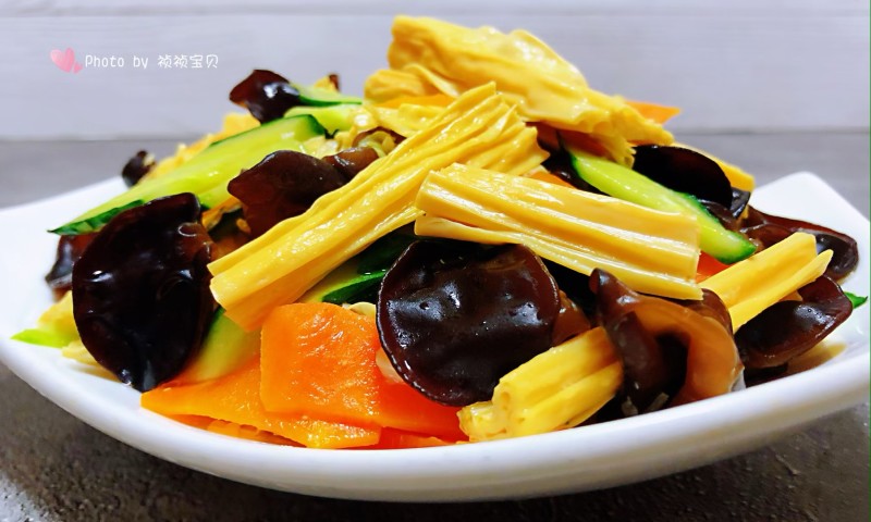 腐竹100g;木耳50g;黄瓜50g;胡萝卜50g;