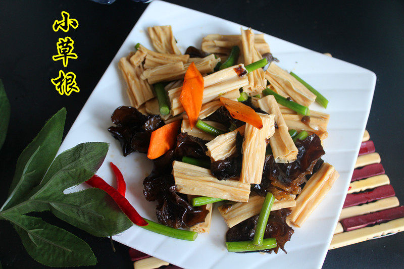 腐竹100克;蒜苔100克;木耳50克;胡萝卜15克;
