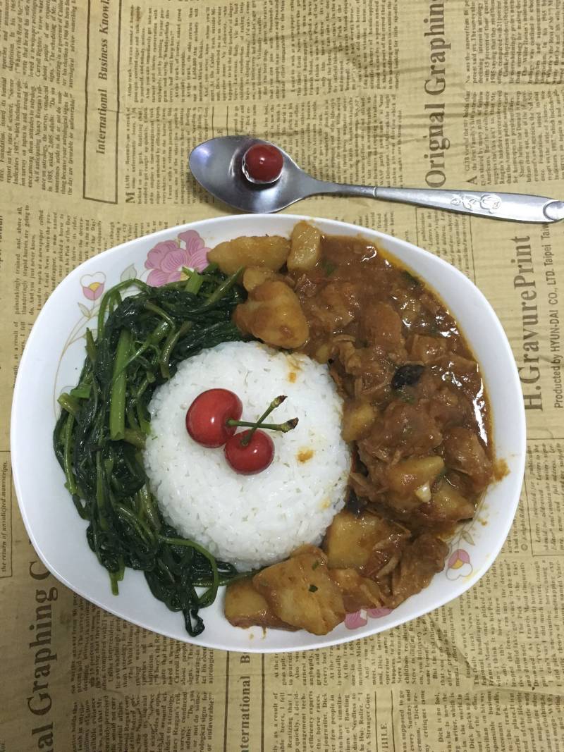 1:先准备好所有食材,青菜炒熟,这里用的空心菜,因为比较喜欢吃,也可以换成生菜,或小白菜,主菜土豆牛腩已经做好的,当然最后还少不了水果啦