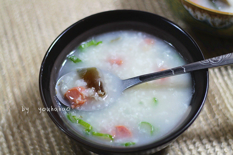 7:熬至米粥浓稠,表面已有粥油时(30分钟后),放入腊肠丁,再煮10分钟;