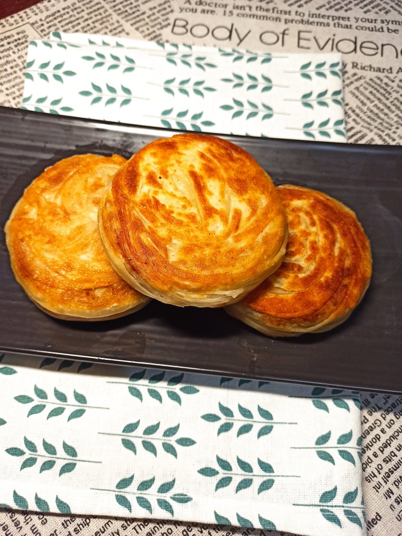 14:将底面焦金黄,转小火,盖盖子,待饼身鼓起来就可以出锅了,再将剩下的饼煎烙完。