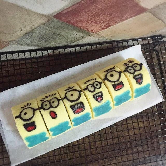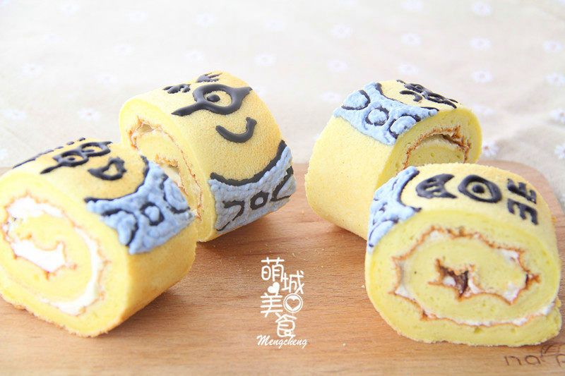 11:淡奶油加入20g白砂糖,打发好后铺上蛋糕卷,用擀面杖辅助,卷起,萌萌的小黄人蛋糕卷就完成啦