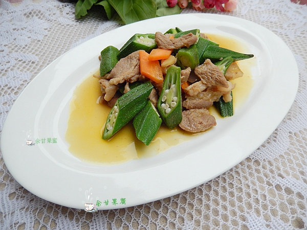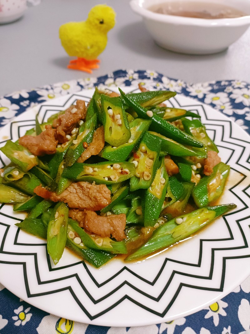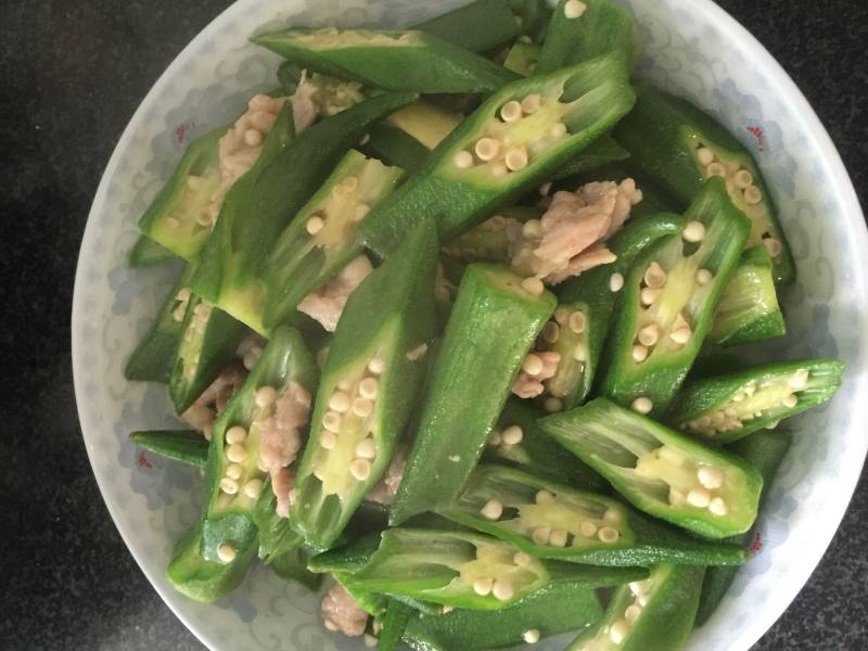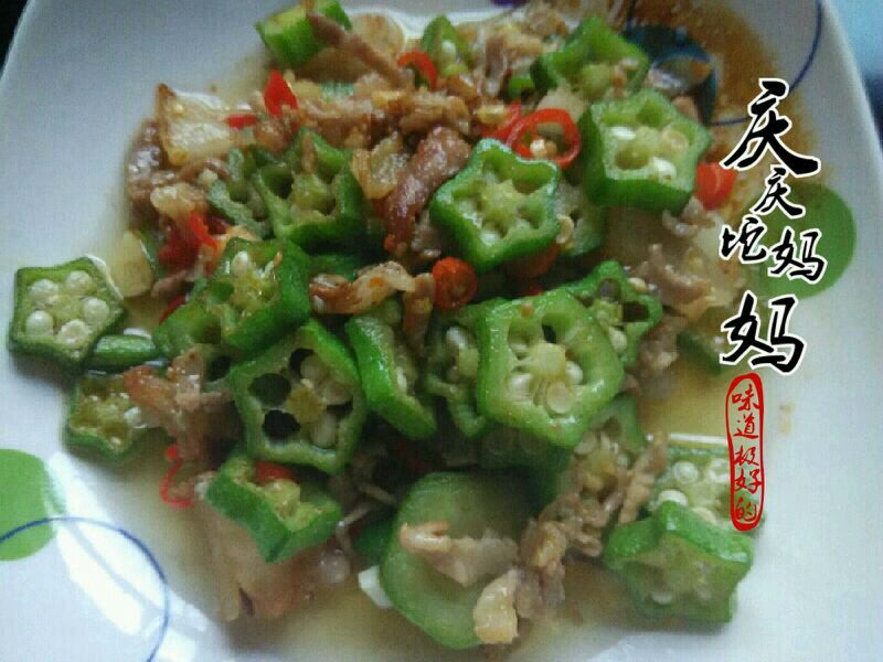 3:把肉炒的差不多,放秋葵,炒几分钟即可