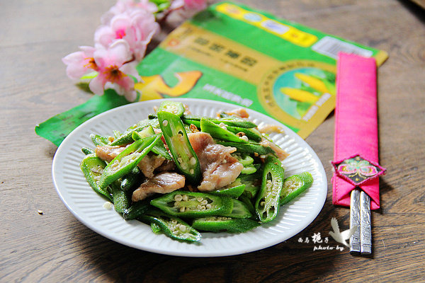 4:炒到秋葵断生后倒入炒好的肉片翻炒,放盐蠔油调味即可。