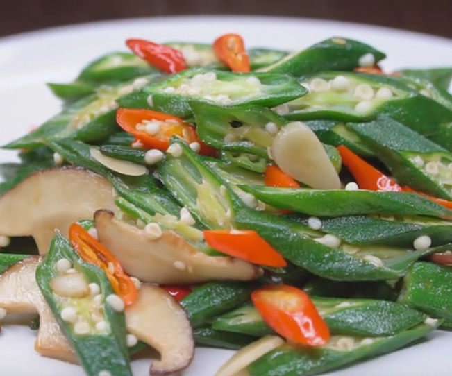 3:炒锅加少许油,将红辣椒爆香,放入秋葵片迅速翻炒,待成熟时烹入酱油适量。