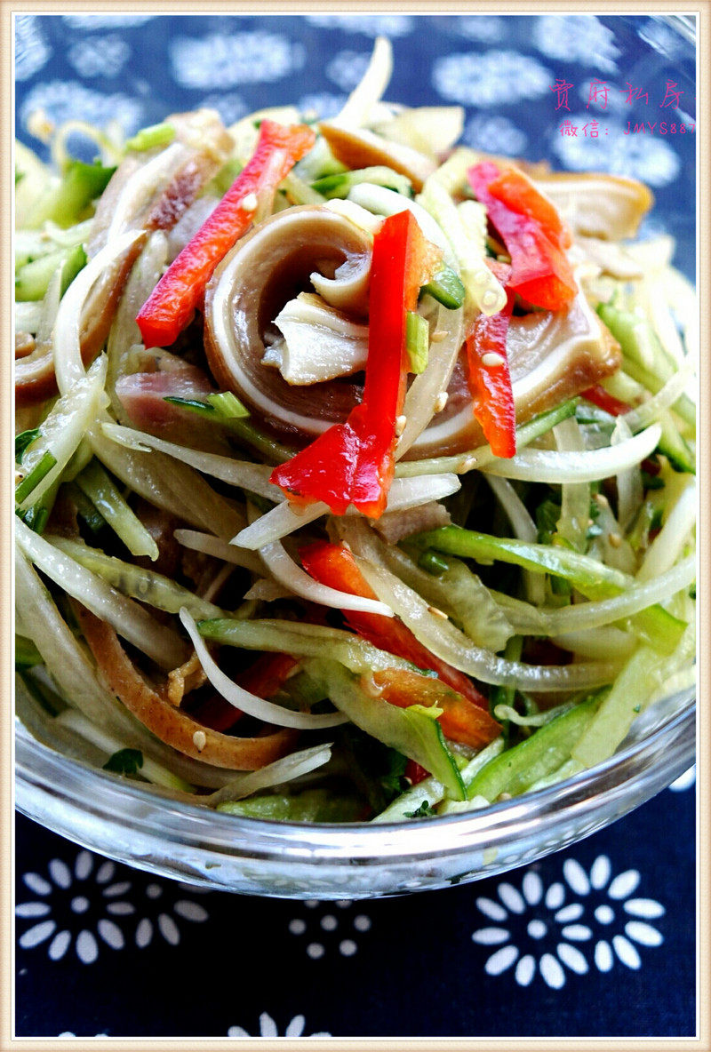 猪耳朵尽量切细丝,辣椒切丝,在碗里调好汁子“蚝油生抽白糖少许陈醋盐辣椒油‘”,倒入菜品种拌匀即可。