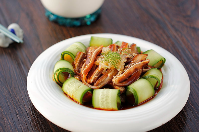 熏酱熟猪耳500g;黄瓜半根;