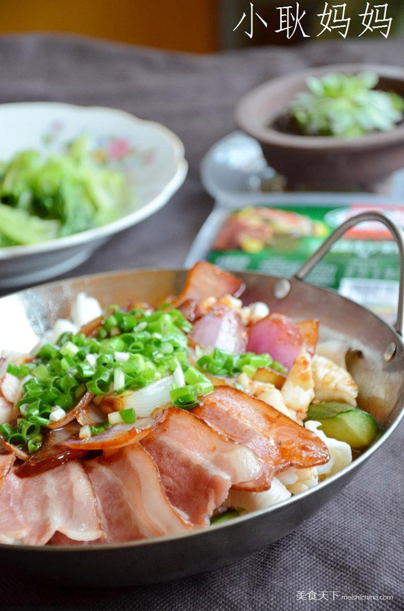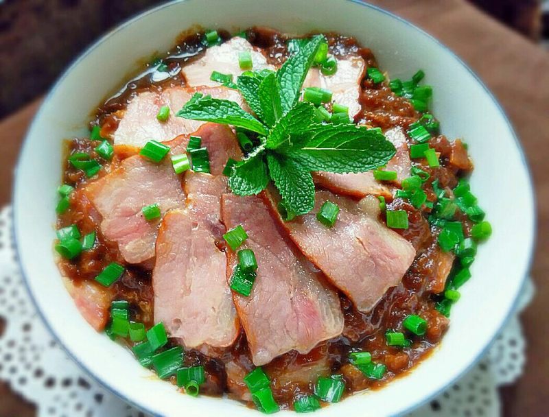 5:把煎好的培根摆到大碗里,然后炒制海鲜酱,配料:海鲜酱蚝油,香菇酱,料酒!炒好浇到培根上,最后烧油浇到酱上撒香葱碎即可!